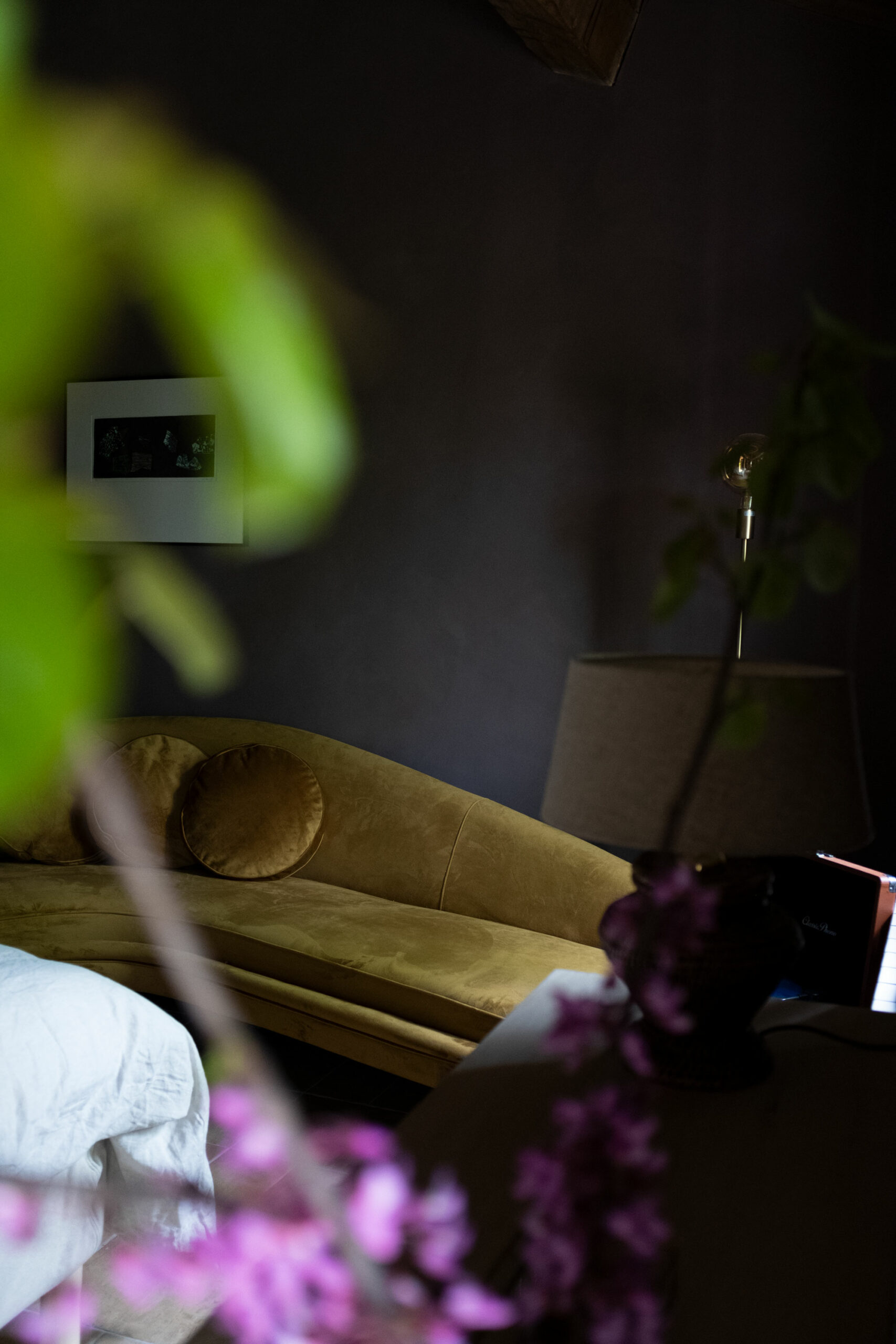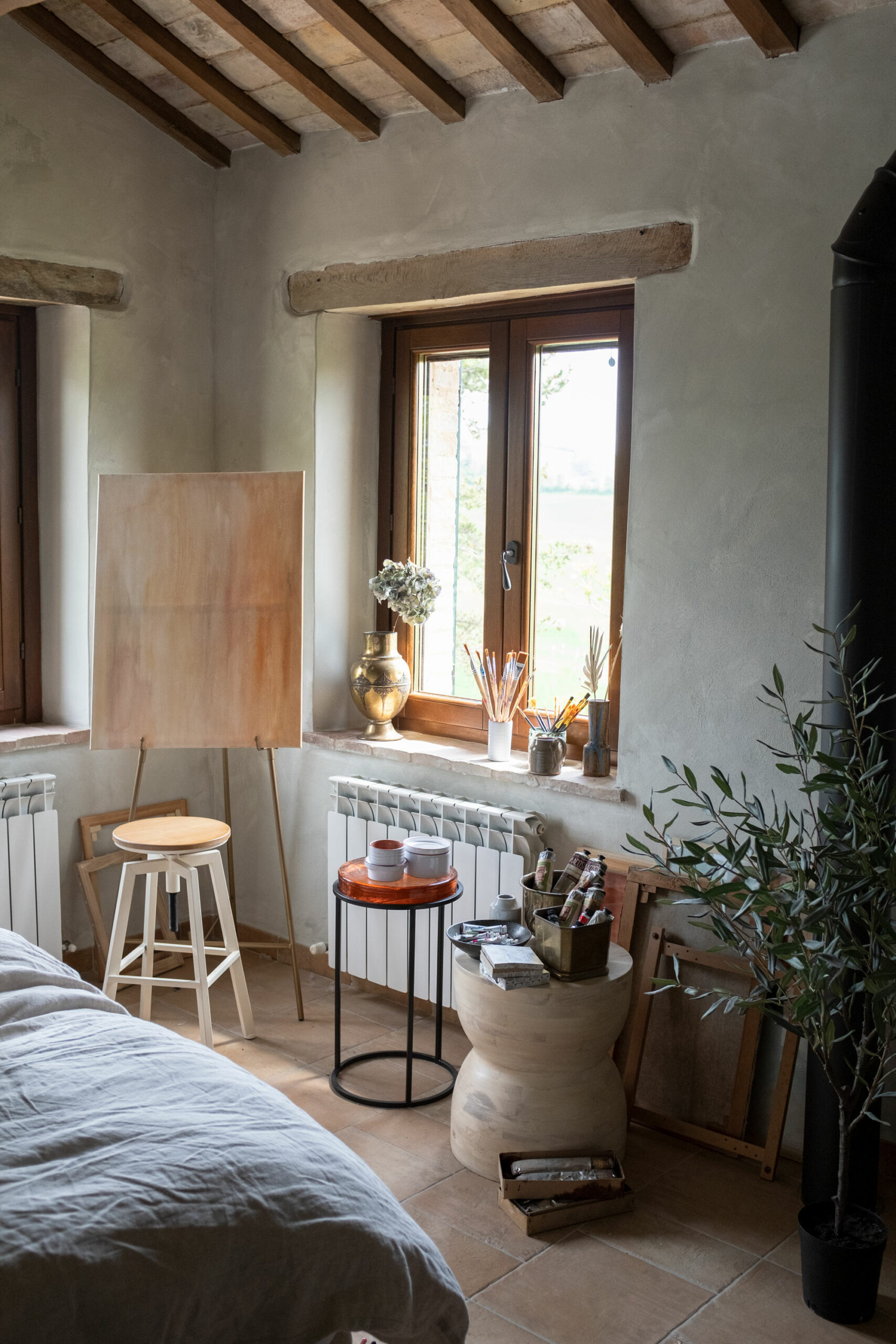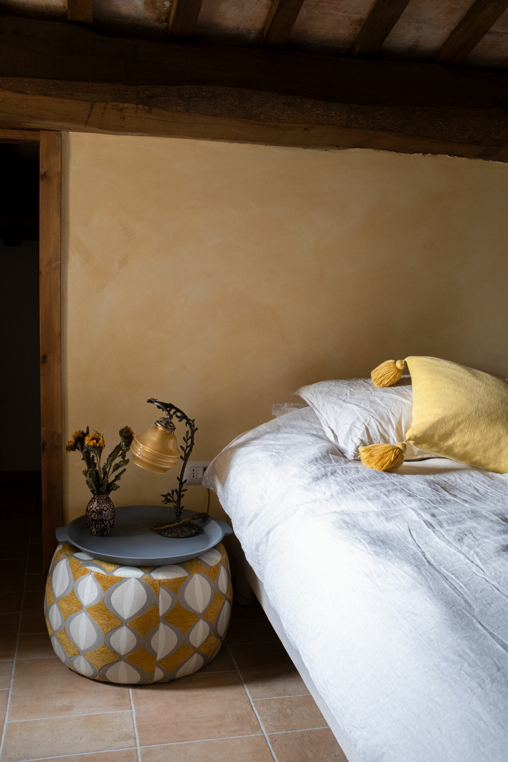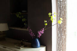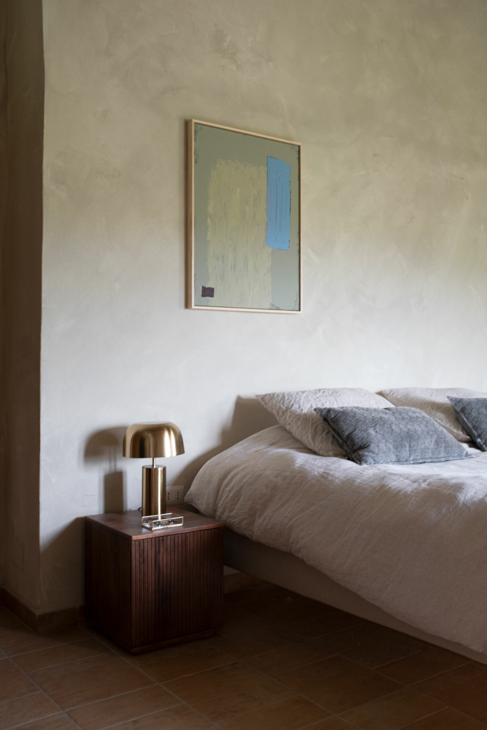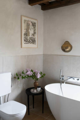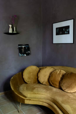 The scenic overlook of a nearby village on top of the mountains presents an ever changing painting at sunset. Life is magical in the mountains of Marche, Italy. It’s that magical sense of the greatness of the mountains and the soft tenderness of the clouds, still hanging low in the morning, that van der Ploeg wanted to captivate in the interior. That softness translates into lime walls painted in a variety of hues, ranging from soft peaches to dark plum like colours. The richness of the Italian landscape but also the Italian kitchen has inspired painters and artists alike. Those same artists and icons were the ones that in turn inspired the interior designer to create unique rooms for them to reside in when visiting Villa Vittorio.
