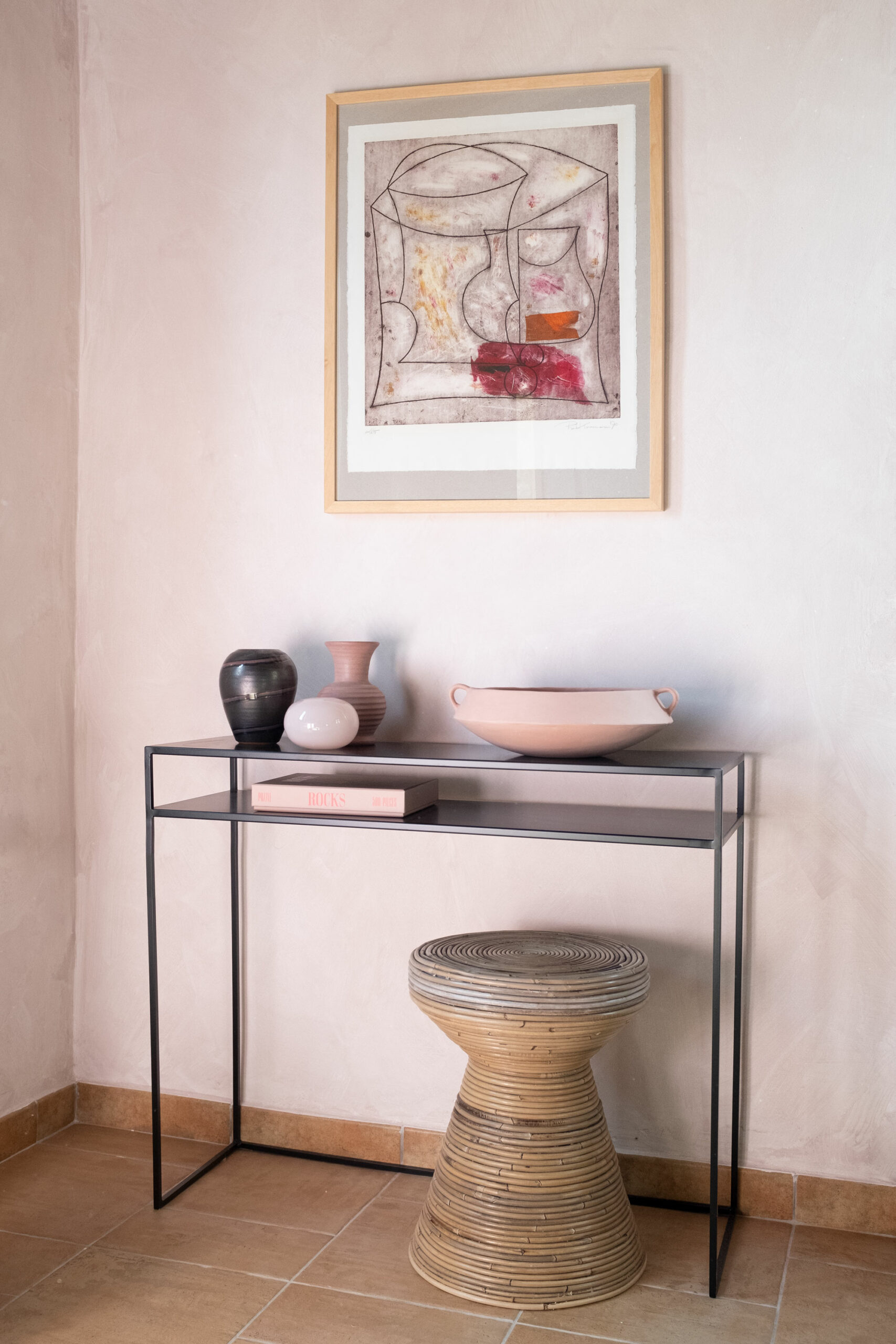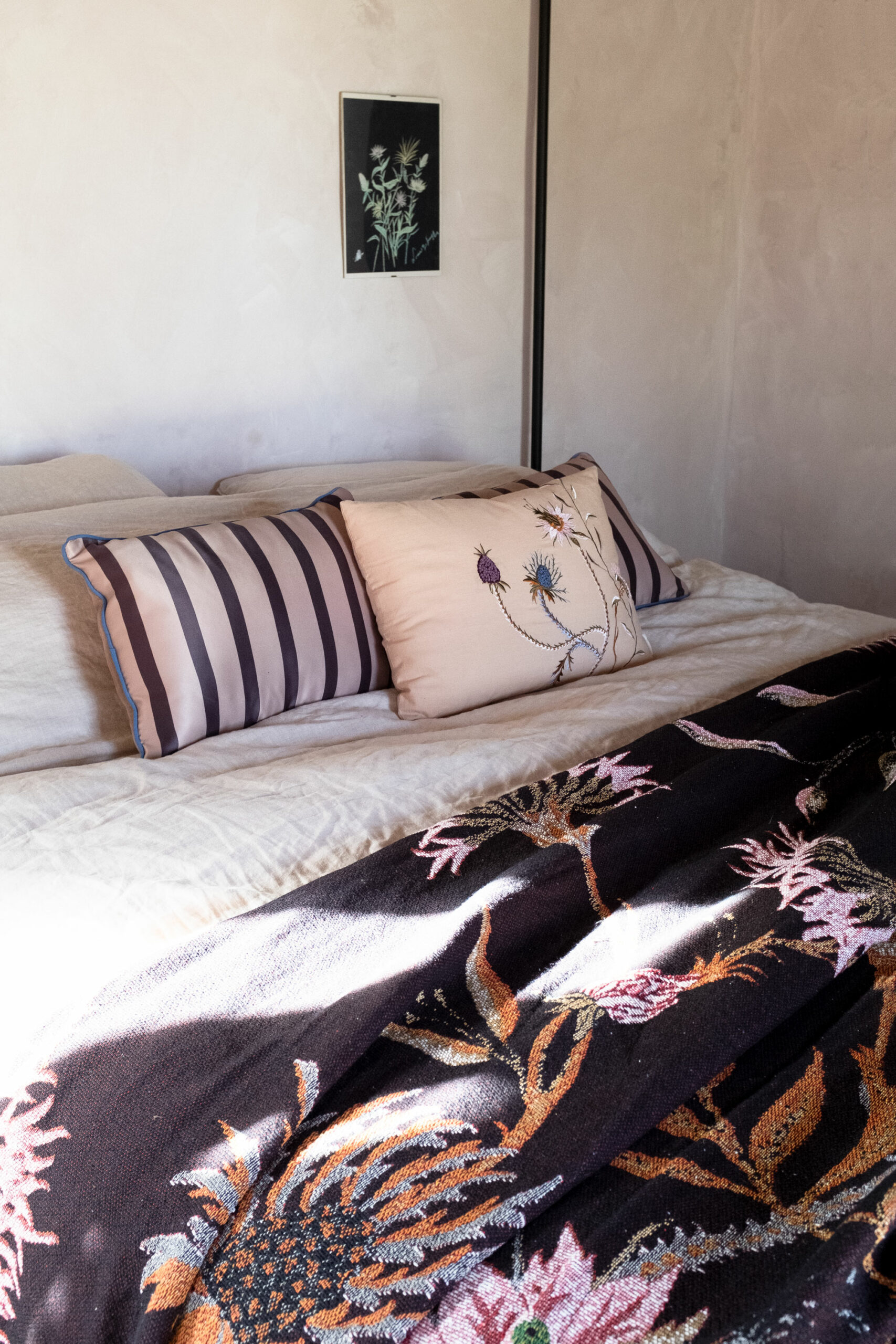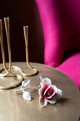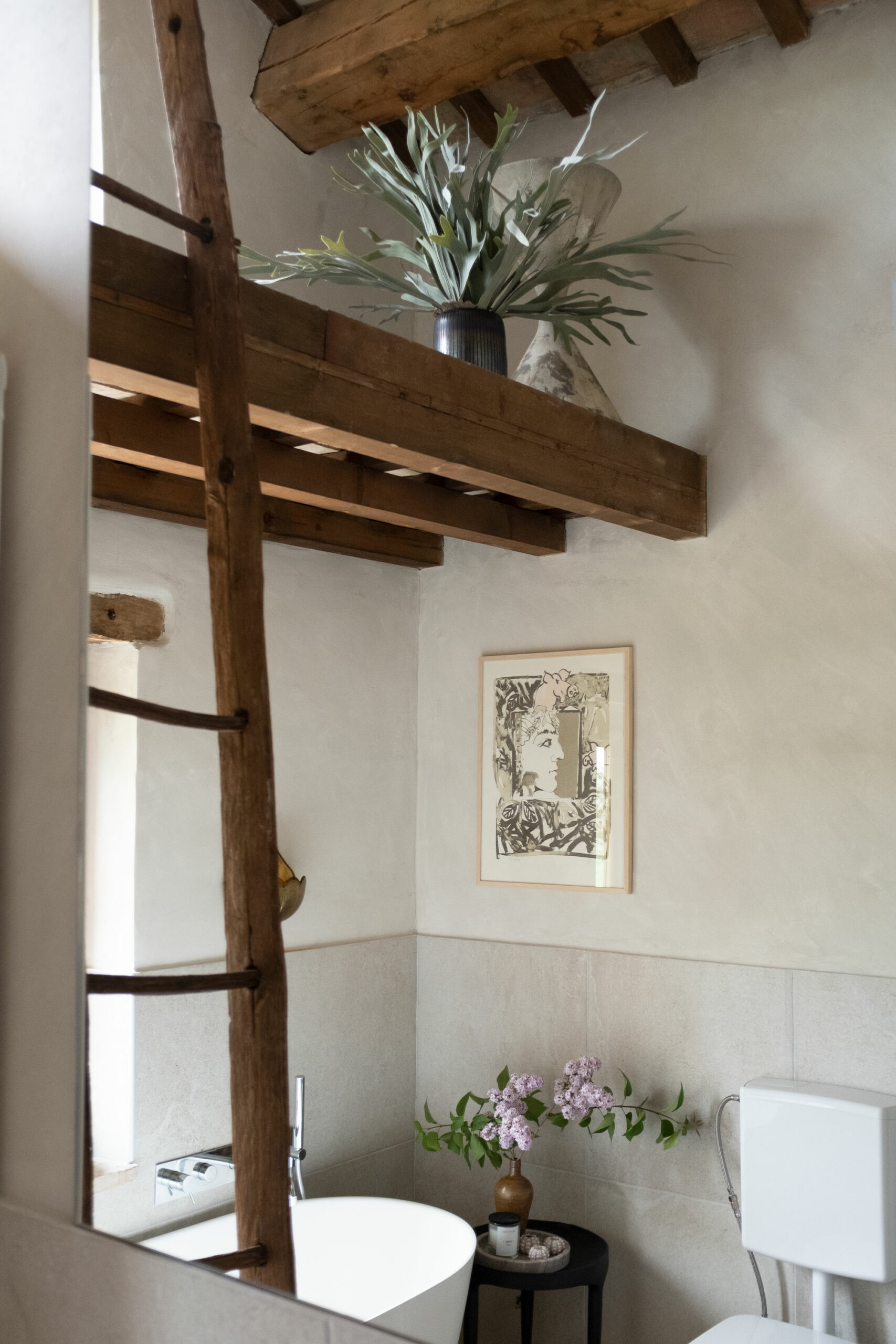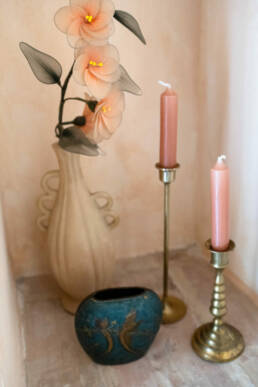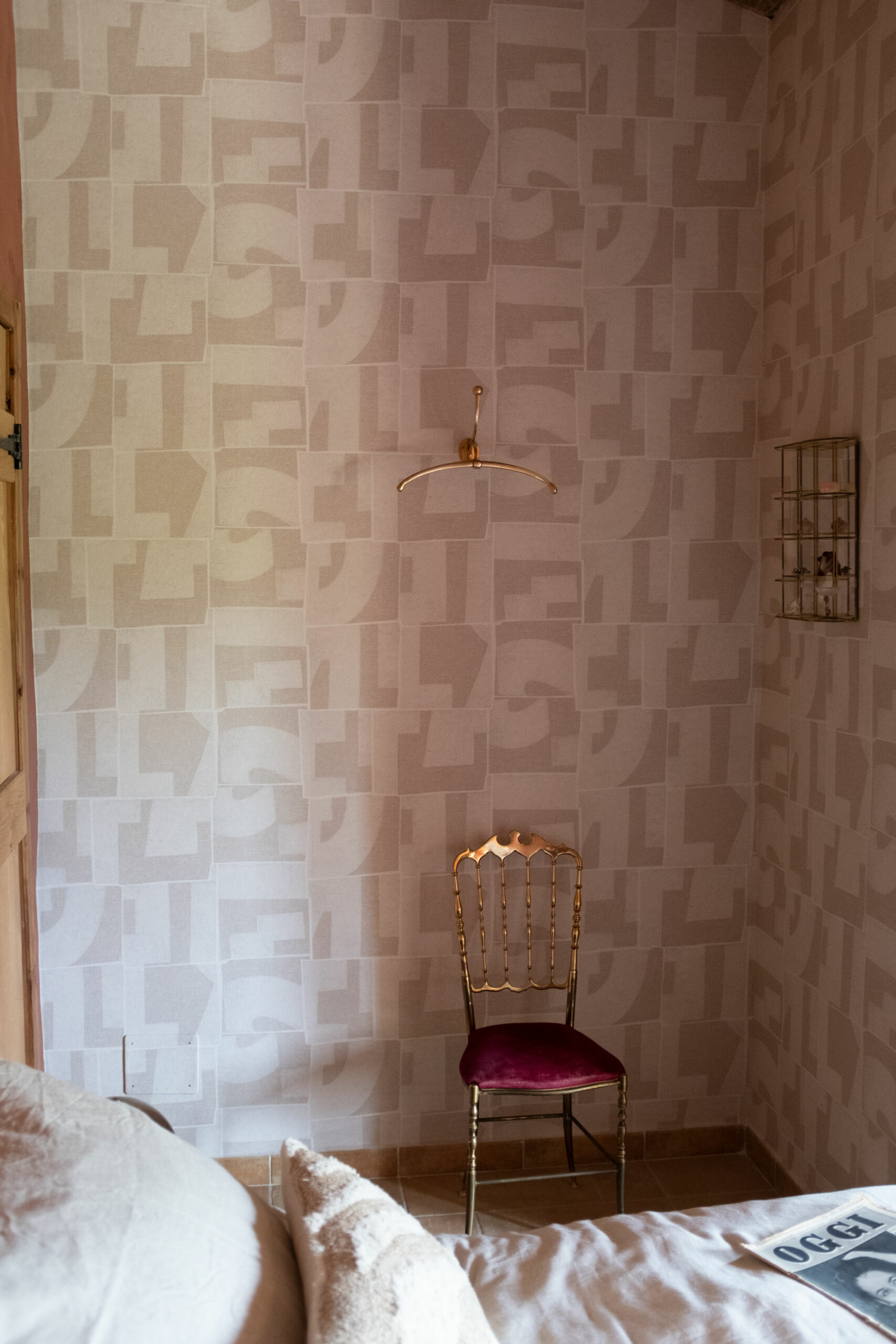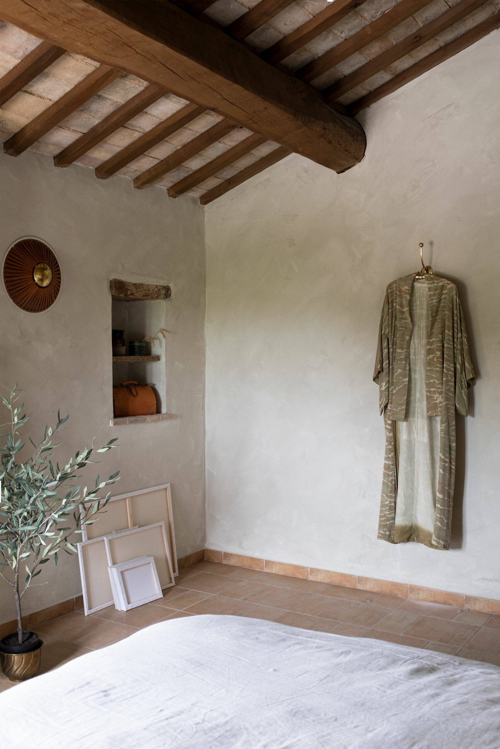 The scenic overlook of a nearby village on top of the mountains presents an ever changing painting at sunset. Life is magical in the mountains of Marche, Italy. It’s that magical sense of the greatness of the mountains and the soft tenderness of the clouds, still hanging low in the morning, that van der Ploeg wanted to captivate in the interior. That softness translates into lime walls painted in a variety of hues, ranging from soft peaches to dark plum like colours. The richness of the Italian landscape but also the Italian kitchen has inspired painters and artists alike. Those same artists and icons were the ones that in turn inspired the interior designer to create unique rooms for them to reside in when visiting Villa Vittorio.
